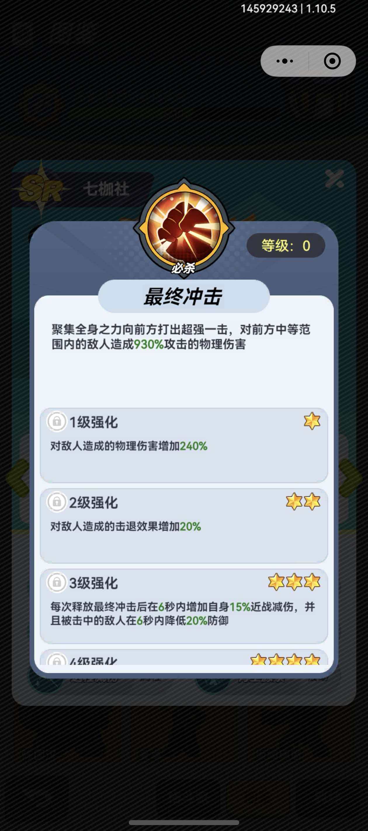 战斗时,七枷社的基础必杀技能有着200%的攻击力,还能够给全体友军回复4次生命值,这个技能同时还兼顾了治疗的效果,让角色的生存力得到了全方位的保证,玩家若是直接讲七枷社给升级到ssr品质的话,那七枷社的攻击力将会提升6%,而且她的防御基础奥数喷气反击所带来的击退效果还会增加20%,这个击退效果,可以很好的敌人的进攻节奏给打乱,让我方队友能够在产生击退效果的时候,快速的抓住攻击的优势来对敌人造成高额的攻击。