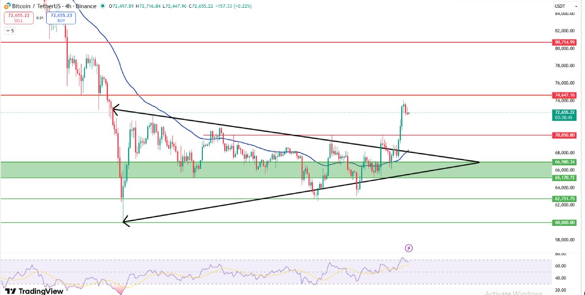 价格不仅成功突破了三角形结构,更重要的是突破了70,000美元的关键阻力区,确认了上涨趋势的有效性。