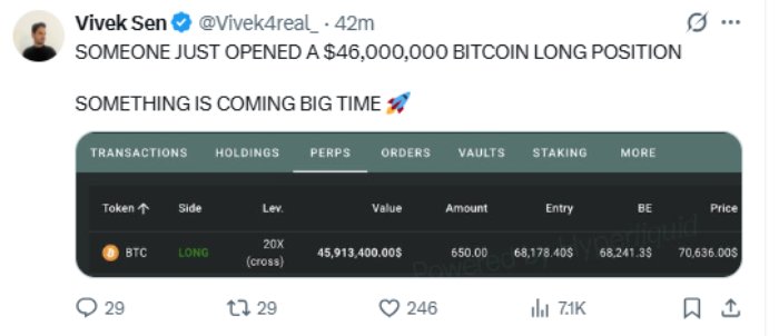 交易活动中另一个引人注目的信号来自Vivek Sen最近在X平台发现的大额比特币多头头寸。