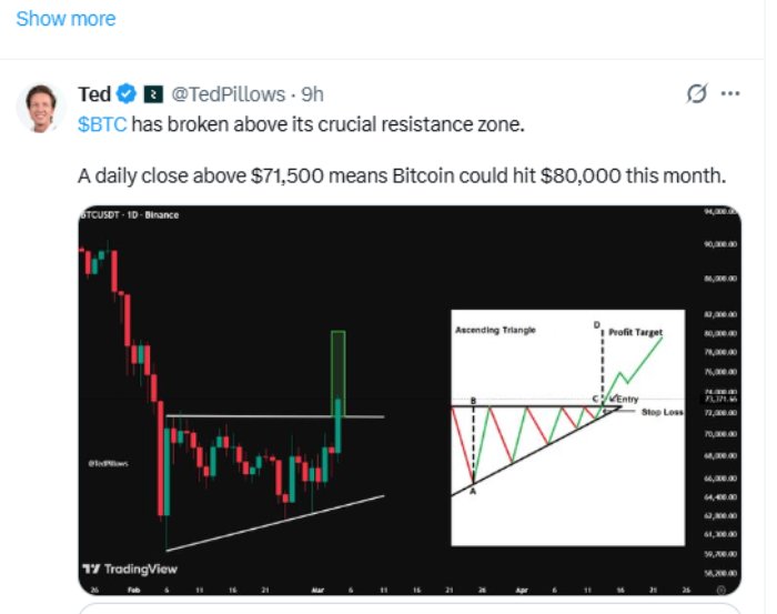 分析师指出,如果价格能够稳定收于71,500美元上方,市场可能在短期内开始向80,000美元的目标价位迈进。