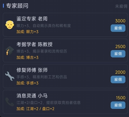 玩家初始身份为一名古玩爱好者,尚未具备专业鉴定能力。面对琳琅满目的瓷器、玉器、书画等藏品,仅凭肉眼难以准确识别真伪与年代特征。此时可启用“专家顾问系统”,通过消耗资源聘请资深鉴定师协助评估,降低误购风险。