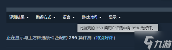 在现有的259条评价中,好评率高达95%。其中英语地区占比最高,共计190条,好评率为96%。简中地区排第三,共计20条评价,好评率为95%。