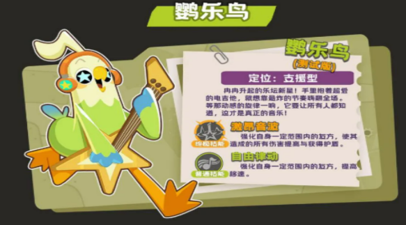 第二个为玩家们介绍的角色叫做鹦乐鸟。这是一个辅助治疗型的角色,在团队中是必不可少的存在,他的技能自由律动,能够让处于技能范围内的敌人在短时间内提升移动速度,而激昂音波则是它的核心技能,处于技能范围内的所有己方成员都将会在短时间内大幅度提升自己的伤害,同时获得一个护盾。