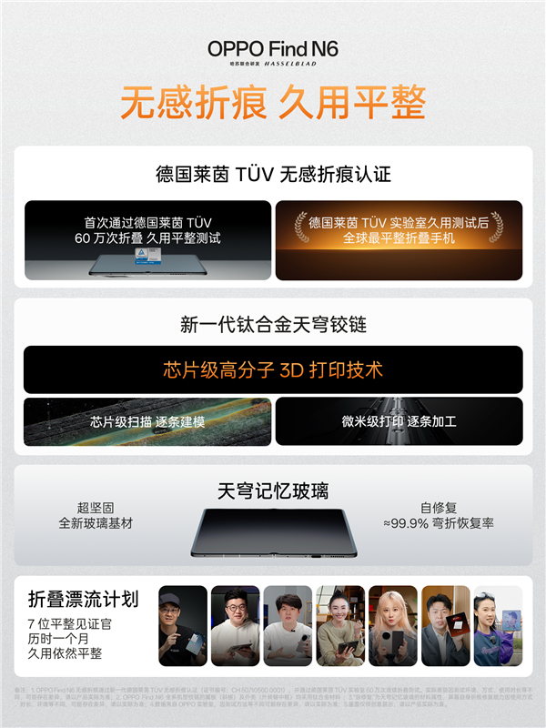 官方介绍显示,Find N6是全球首款通过德国莱茵60万次折叠测试的产品。经过德国莱茵的久用测试评估,它被认定为目前全球最平整的折叠手机。