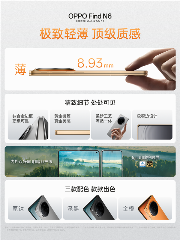 在拥有如此强悍配置的同时,OPPO Find N6的工业设计也达到了新高度。该机在折叠状态下的厚度仅为8.93毫米,真正实现了高性能与轻薄手感的完美平衡。