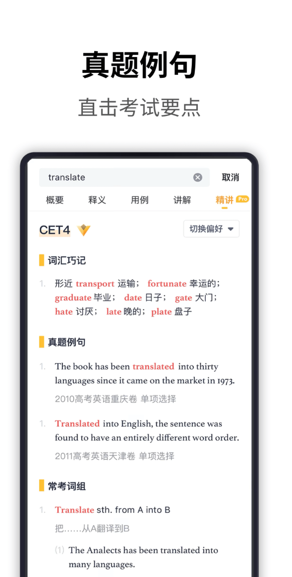 创立于2003年,深耕词典研发逾二十年,注册用户规模达千万级。曾获《英汉大词典》主编陆谷孙教授亲笔题词,学术背书扎实。词汇精讲栏目系统解析高频词组搭配、近义词辨析要点、构词逻辑及历史溯源,不止于翻译,更重语言理解。考频统计模块基于真实考试语料库分析,标注单词在四六级、考研、雅思、托福等主流考试中的出现频次,帮助用户聚焦核心词汇,提升备考效率。