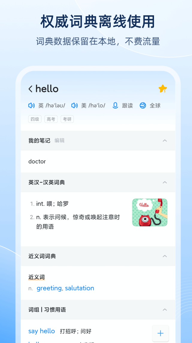 被广泛视为安卓平台专业词典类应用的标杆之一。基础词库含通用英汉词条30万条,扩展专业术语40万条,配套例句达178万条,覆盖学术、科技、医学、法律等细分领域。拍照取词支持摄像头实时预览取词,阅读PDF或网页时可直接框选查释。跨应用取词功能可在微信、浏览器、文档软件等任意前台应用中呼出词义面板,大幅减少应用切换频次,提升信息获取连贯性。