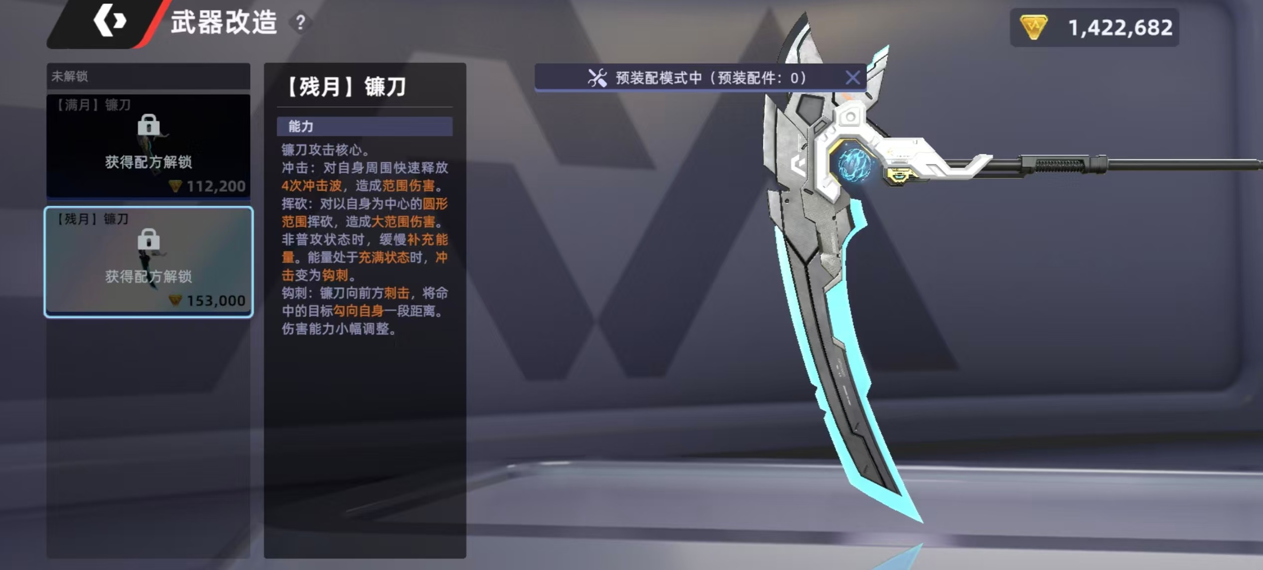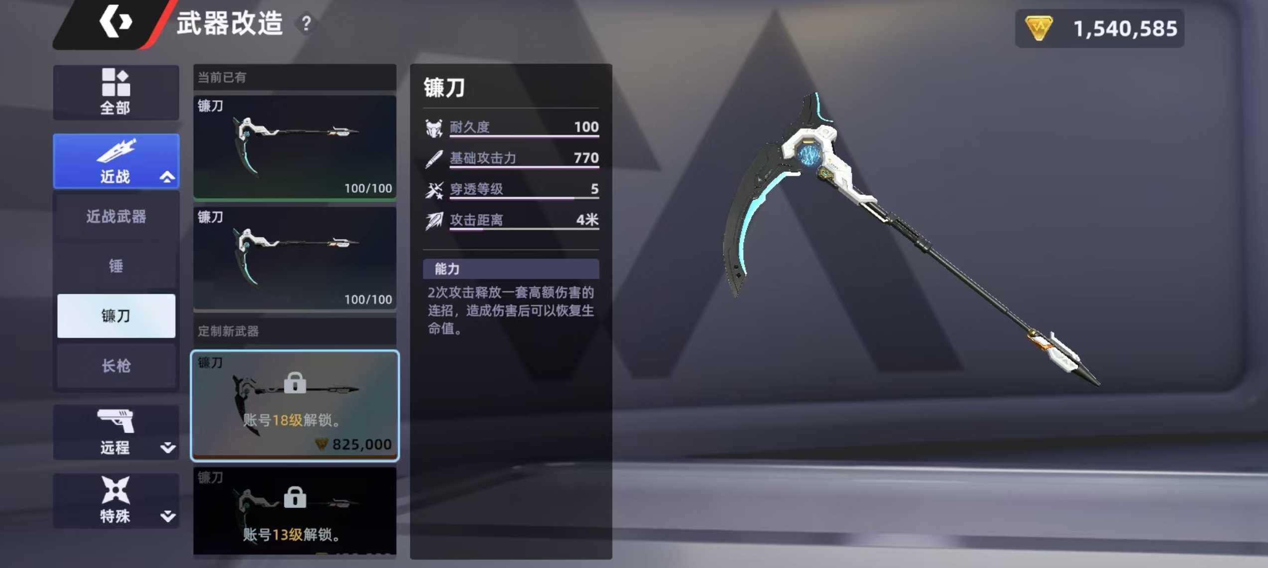 在改造之后,能获得更强的战斗能力,对自身周围快速释放冲击波造成范围伤害,还有挥砍能力,以自身为中心打出圆形范围内的挥砍,造成大范围伤害。在处于非普攻状态时可缓慢补充能量,当能量充满后冲击变成勾刺,向前方刺击后命中目标,可向自身勾回一段距离。结合这些技能效果不难看出,镰刀这款武器很适合持续近战和拉扯续航使用,在近距离缠斗,残血反打和持续战斗等场合搭配上远程武器,能够很好的补伤害和控场。