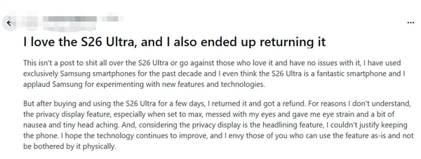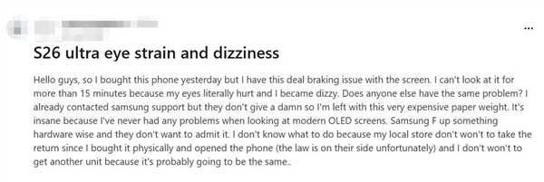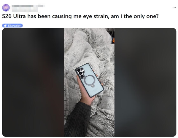 然而,随着产品的大规模上市,部分用户开始在社交平台上反馈使用中的不适感。有多位用户表示,在使用Galaxy S26 Ultra一段时间后,出现了明显的眼睛疲劳、头晕甚至恶心等症状。
