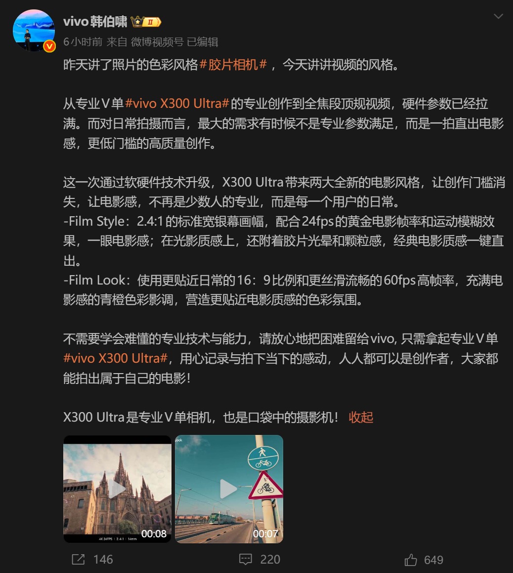 时间:2026-03-19 | 作者: | 阅读:03月18日消息,vivo产品经理韩伯啸近日连续发布博文,围绕即将发布的vivo X300 Ultra影像能力进行预热,重点展示了视频风格与全新色彩体系两大升级方向。从官方披露的信息来看,这款新机在“专业V单”定位之下,正试图进一步降低高质量影像创作门槛。