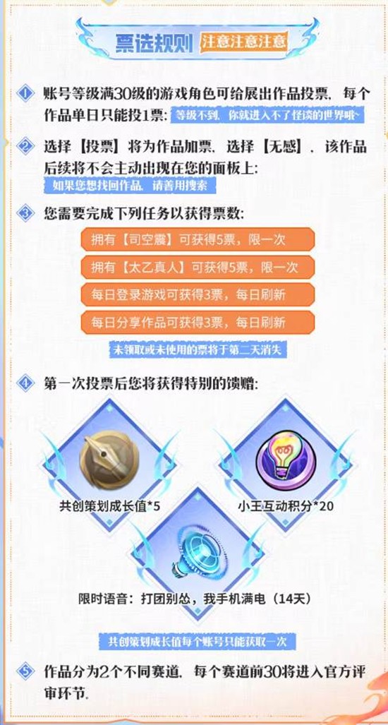 为感谢玩家的积极参与,官方为首次成功参与投票的玩家准备了专属好礼,包括:共创策划成长值*5、小王互动积分*20,以及限时语音"打团别怂,我手机满电"(14天)。