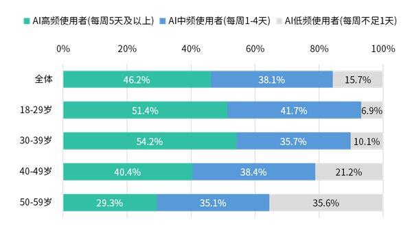 AI使用者中,“每周使用5天及以上”的高频使用者占比达到46.2%;“每周使用1-4天”的中频使用者占38.1%。两者合计来看,约85%的生活者每周至少会使用一次AI。其中,30-39岁人群中的高频使用者占比最高,达到54.2%。该人群中不少人在工作与育儿的繁忙日常中,通过AI来有效利用时间。(数据2)