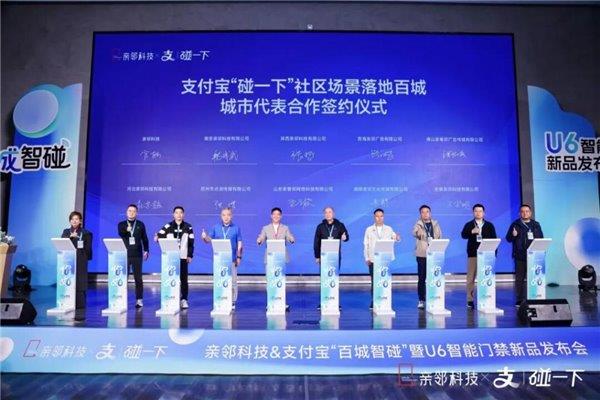 发布会上同步举行了支付宝"碰一下"社区场景落地百城·城市代表合作签约仪式,亲邻科技全国100城合作商代表齐聚现场,与亲邻科技董事长兼CEO官轲共同签约,携手开启合作新征程。此次百城联动,旨在推动U6智能门禁在全国社区的规模化落地,依托亲邻科技覆盖全国200座城市、70000个社区的线下网络与支付宝的数字生态优势,合力打造"科技赋能+生态协同"的智慧社区新范式。"百城智碰"的规模化推进,不仅为智慧社区产业升级注入强劲动力,更带来广阔的市场机遇,为行业高质量发展注入坚定信心。