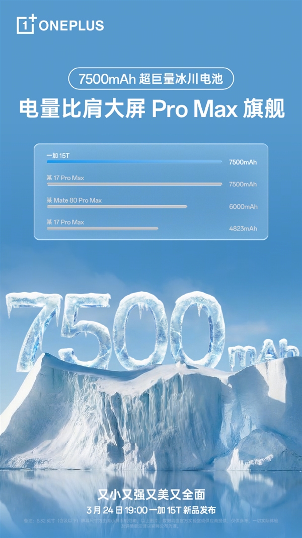 一加15T全球首发7500mAh超巨量冰川电池 李杰:断层碾压其他所有小屏
