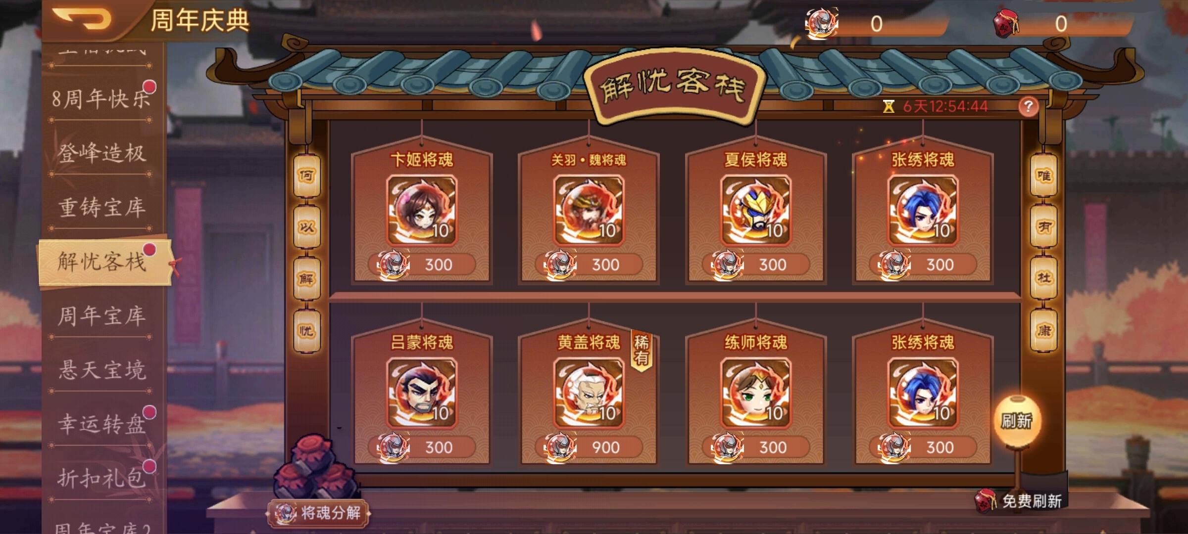 活动内容:活动期间,可通过【武将之魂】兑换将魂,可通过【解忧酒】刷新客栈的将魂,每天有一次免费刷新次数。