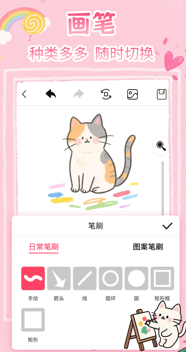 自由创作与填色练习并存,两种模式切换自如,适合不同阶段的孩子使用。自由画布区域没有边界限制,手指划过屏幕就能留下痕迹,笔刷类型涵盖普通、图案、背景色三种,橡皮擦随时可用,改起来也不费事。填色区域收录了数十个主题素材,从日常用品到恐龙超人都有,区域识别技术让上色只需轻点一下,颜色不会跑出边界。