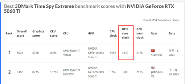 与此同时,技嘉在甜品级市场也有亮眼表现。技嘉RTX 5060 Ti 8G魔鹰显卡凭借卓越的超频潜力,在3DMark Time Spy Extreme基准测试中核心频率突破至3.33GHz,展现出强劲的超频能力。