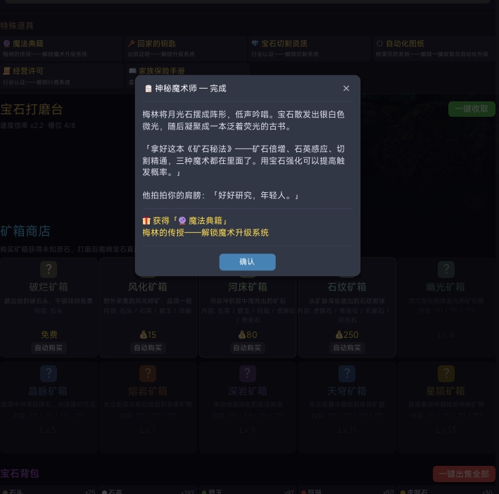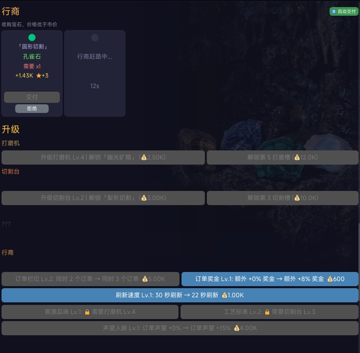 因此,玩家们在前期时可不走行商的路线,直接将打磨好的宝石全部卖出,令自己能快速回本,好买到更多的矿箱,顺便完成职业等级的提升好提高自己的身份地位。而到后期,玩家们可在兑换出自动打磨功能、自动切割功能和自动卖给行商功能后,将打磨好的宝石留下来专做行商的订单,以此来赚取更多的收益。