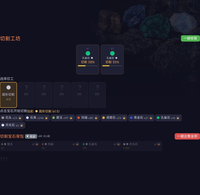 游戏中的赚取方式主要有两种,其一是直接将打磨好的宝石卖出,其二是将宝石卖给前来进行收购的行商。其中,直接将宝石卖出是最快的赚取方式,并且游戏支持一键卖出,玩家们可将背包里的宝石一块打包出售,只不过这一方式所卖出的宝石在价格上会较为固定,即便是经过切割的宝石,价格也不会高上太多。而卖给行商就不一样了,行商会挂单列出自己想要收购的宝石,同时也会指定宝石的工艺,只要玩家们完成对宝石的处理,且数量达到后就能将它们卖掉,虽然价格上会有些许波动,但在收益方面要比直接卖出宝石高上许多,唯一的难点在于行商有CD,每次完成订单后,都要等上一段时间,行商才会再次挂单与玩家交易。