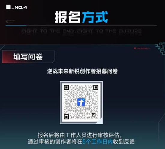 有意向的逆行者只需扫描官方发布的"逆战未来新锐创作者招募问卷"二维码,完整填写问卷并提交即可。报名后将由官方工作人员进行审核评估,通过审核的创作者将在5个工作日内收到反馈。