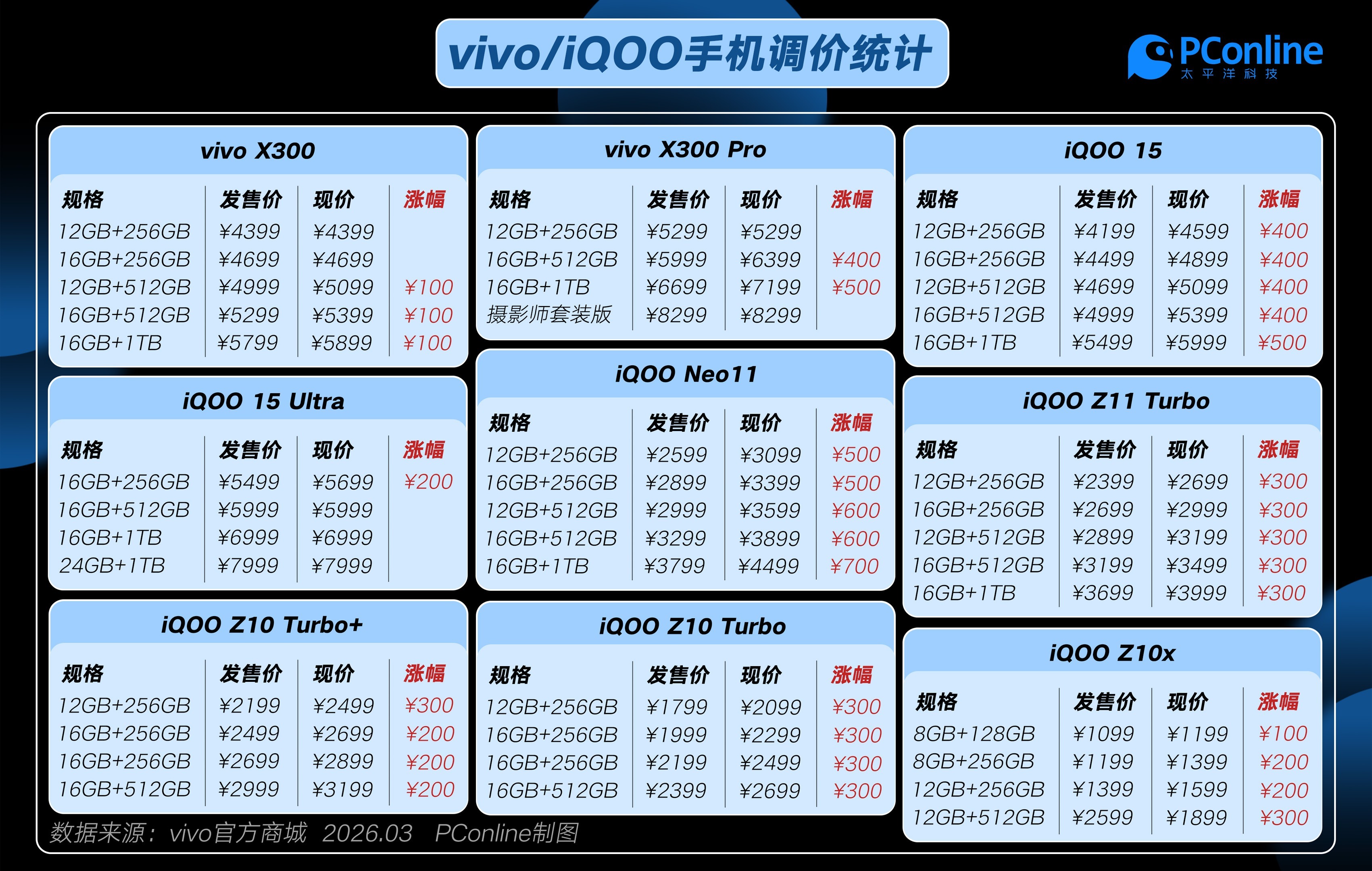 PConline对照官方商城价格,汇总了vivo/iQOO多个系列产品的价格变化。从具体机型来看,vivo X300系列率先调整,其中vivo X300的12GB+512GB、16GB+512GB及16GB+1TB版本均上涨100元;vivo X300 Pro则上涨幅度更大,16GB+512GB版本上涨400元,16GB+1TB版本上涨500元。
