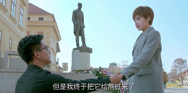美丽的布拉格广场,街头艺人们演奏着浪漫的歌曲。王旭单膝跪地,向邱岩求婚。艺人们送上戒指,王旭亲自将戒指戴到了邱岩的手上。
