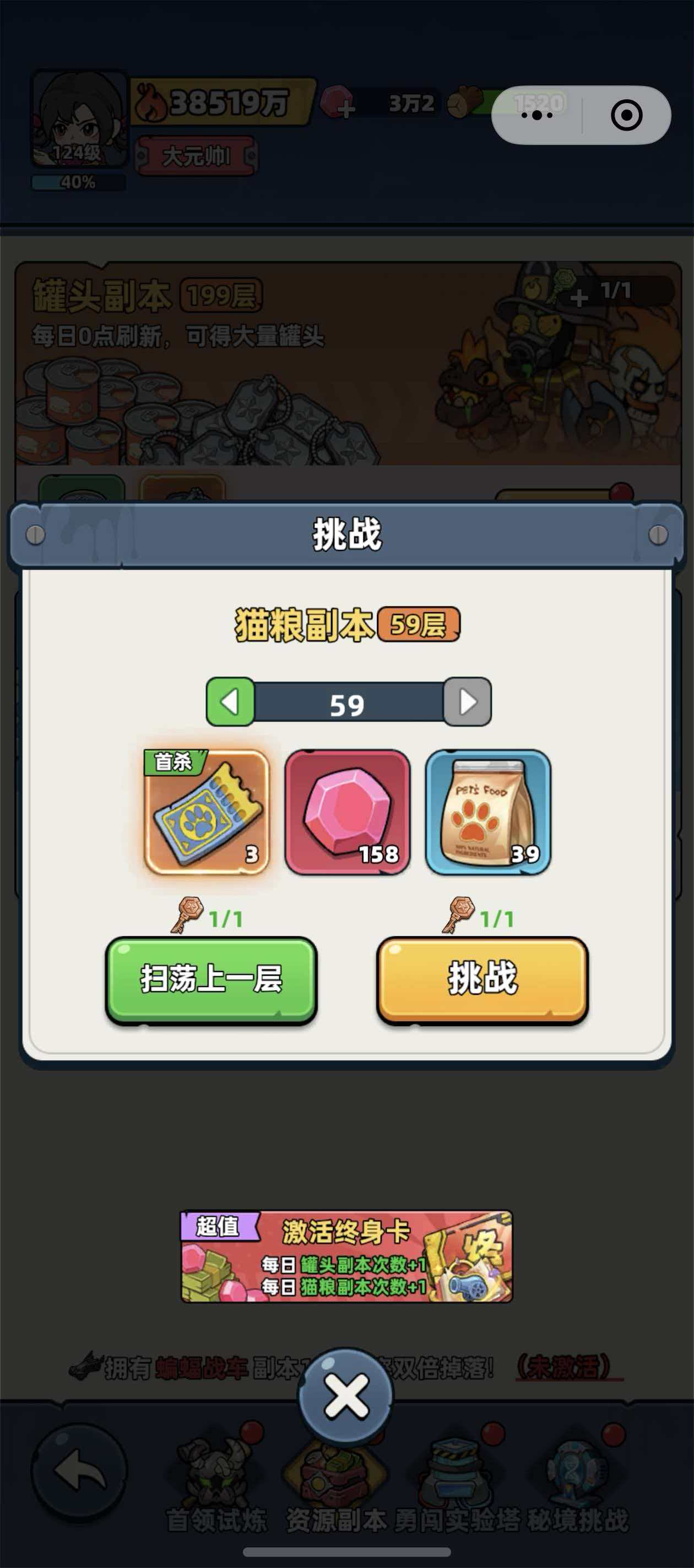 资源副本是猫粮最稳定、最高产的来源,入口位于主界面“挑战大厅”二级菜单。该系统包含两个独立副本:罐头副本(解锁条件:玩家等级≥列兵)与猫粮副本(解锁条件:玩家等级≥排长)。猫粮副本虽难度更高,但收益显著优于罐头副本——单次通关固定获得39包猫粮+158钻石。完成该副本首次通关(即“首杀”),额外奖励3张宠物契约券,该奖励仅限首次领取,重复通关不触发。