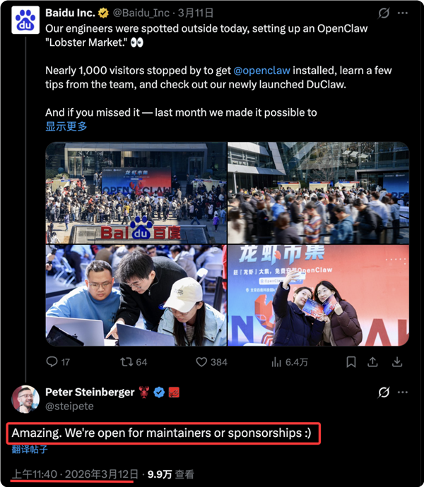 此前,他便在海外社交平台多次点赞相关内容,还在多个帖子下连续留言,盛赞中国AI创新速度“Amazing”(令人惊叹),并明确表达了愿与百度携手,共同开发“龙虾”类AI产品的意愿。
