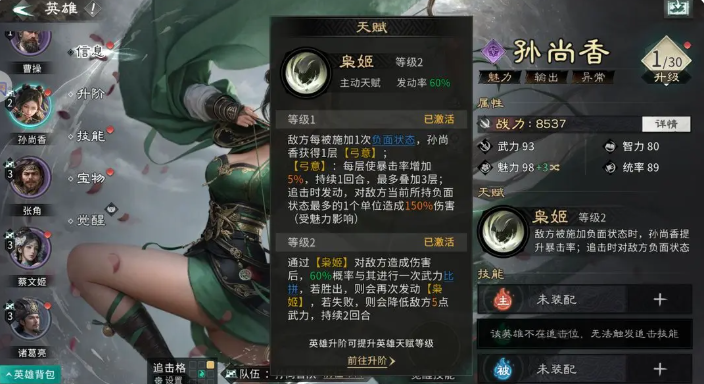 第二套阵容,大家如果还是更注重PVP的话就可以玩儿这个阵容,里面大家可以用的角色有孙尚香、大乔跟蔡文姬,玩儿起来的话,这个阵容可能在获取难度上面需要一些投入,比如如果其中的角色实在拿不到,大家就可以想办法通过首充来获取这个阵容,其实在组合成功之后,大家看到的战力经过培养以后可能会比第一个阵容还要高一些,但是在这个阵容里面,大家要玩儿战法的话,考虑的也要更多,在叛军讨伐之类的关卡攻击的时候,其中武将他们的魅力数值都一定要点满,大乔带的技能是一定要用反间计的,这个技能可以让她保证自己开局的优势,在混乱状态成功施加给敌人之后节奏基本是掌握在我方手上。