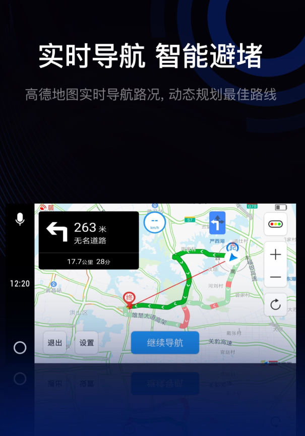 专为车载场景深度优化,兼容iOS与Android双平台,适配市面上超90%主流车型。支持有线投屏、无线CarPlay/HiCar、无感自动连接三种接入方式。语音识别模块由科大讯飞定制开发,针对行车环境中的风噪、引擎声、人声混杂等干扰进行专项优化,识别准确率保持高位;唤醒词支持自定义设置,全程实现免触控操作。导航引擎深度对接高德地图SDK,实时同步拥堵信息与事件预警,支持通勤时段路况趋势预测推送。创新实现手机端车载对讲功能,支持多人语音群组即时通话,并集成位置共享、车队跟随等协同出行能力。