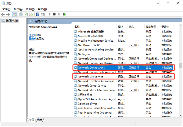1、按下 Win R,输入 services.msc 回车。2、在服务列表中找到以下几项:Network ConnectionsDHCP ClientNetwork List Service3、双击打开后检查启动类型是否为【自动】,服务状态是否为【正在运行】。4、如果未运行,点击“启动”。5、设置完成后重启电脑再测试。