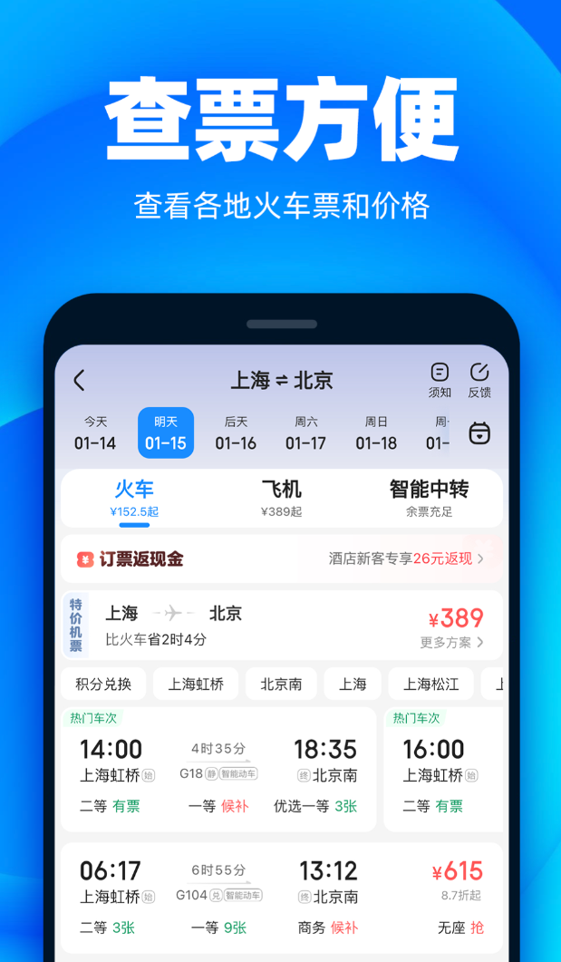 高铁票查询模块直接调用12306实时数据接口,余票状态更新及时准确;退改签全流程在线完成,无需线下窗口办理。平台“牛人专线”服务累计服务用户超542万人次,综合满意度达97.2%。支持高铁票与跟团游、自由行产品打包预订,实现交通+住宿+景点的一站式下单。新用户注册即赠888元无门槛红包,限时秒杀活动频次高;老用户每月可领取专属生日礼金,增强长期使用黏性。