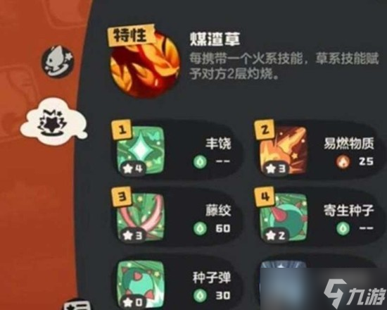 在技能选择上,一套常见的组合是易燃物质、充分燃烧、藤缚与毒袭。易燃物质作为多段攻击的草系技能,能高效触发煤渣草特性,单回合内可迅速叠加大量灼烧层数。