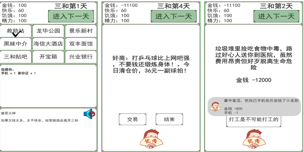 本作以现实主义题材切入,采用文字冒险+生存模拟双驱动机制。玩家将扮演一名身处深圳三和人才市场的真实角色,通过接取日结零工、规划食宿开销、选择过夜场所等方式维系生存指标。全程无战斗、无数值膨胀,依靠细腻文本与多线分支塑造高度代入感的社会观察体验。