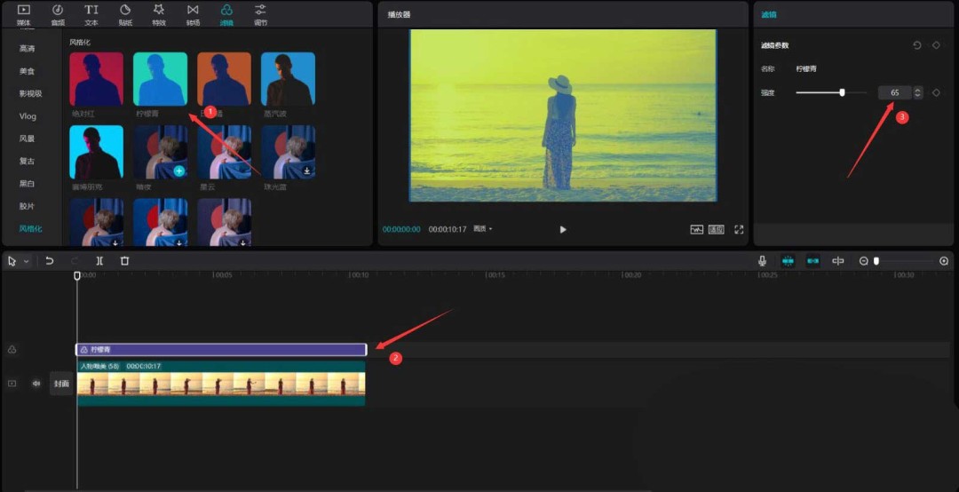 将滤镜时长拉至与视频一致,并将滤镜强度调整到65左右,使颜色效果更醒目自然。