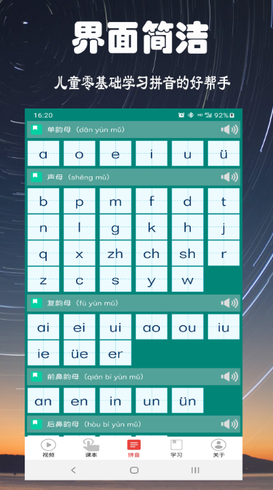 该应用采用“音律驱动记忆”策略,将全部拼音要素嵌入原创儿歌体系。每个声母、韵母均对应一首节奏明快、押韵自然的童谣短片,动画角色同步口型演示,强化听觉输入与动作模仿的神经联结。提供双速跟读模式:慢速档逐音拆解,保障初学者听清起始音、介音、韵尾;标准档还原日常语流,助力语音自动化输出。童谣内容符合3–6岁儿童认知节律,无复杂词汇干扰。