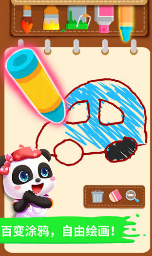 以熊猫IP为叙事主线,构建亲子共玩场景。内置多套预设画板,色彩饱和度高、对比鲜明,精准适配3-6岁儿童视觉敏感期特征。操作逻辑极简——无需绘画基础,仅需点击选色+区域轻触,即可生成完整作品,有效降低使用门槛,强化正向反馈循环。