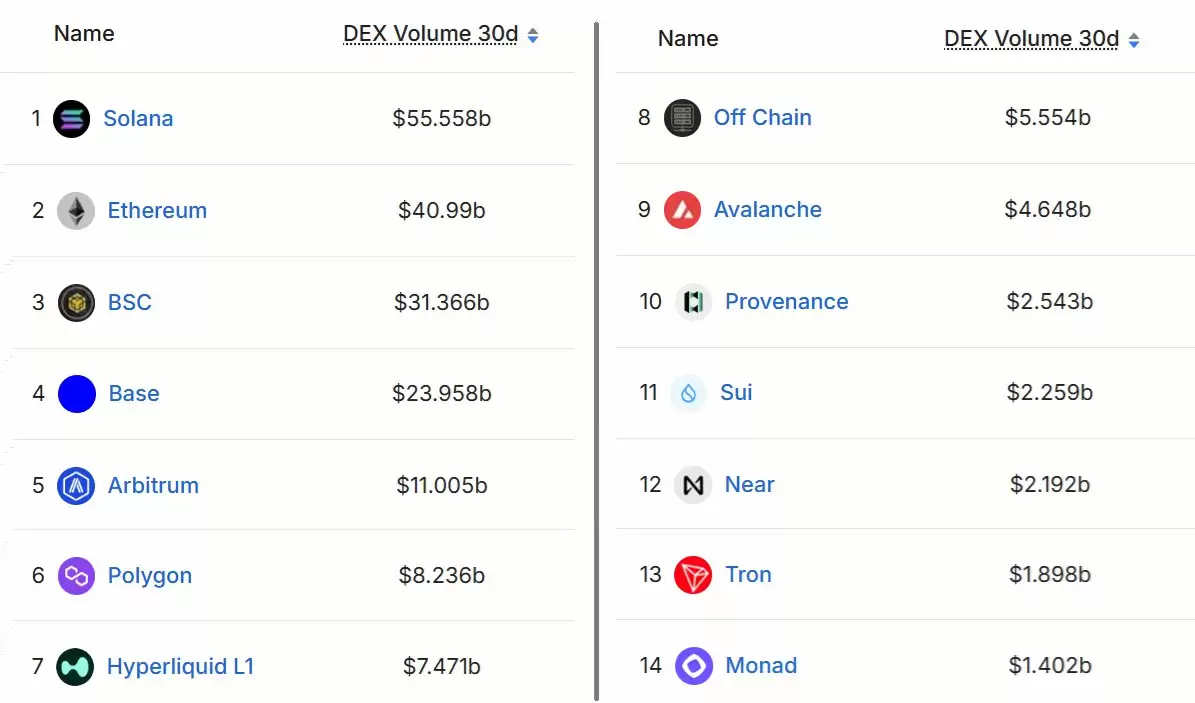 按30天去中心化交易所交易量排名的区块链,单位:美元。来源:DefiLlama