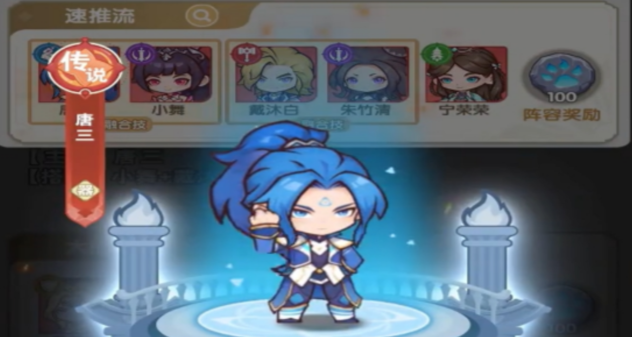 大家在前期,如果想要组建一支强大的阵容,首先就需要了解自己的需求,如果是想要大招流派的玩家们,可以先选择千仞雪,把这个角色放在前排,充当一个防御类型的,之后再选择唐三这个角色,直接控制全场,还可以加上小舞这个角色进行辅助攻击,接着在后排选择唐昊这个角色来不断的强化整个队伍的一个攻击能力之后加上阿银这个辅助角色。