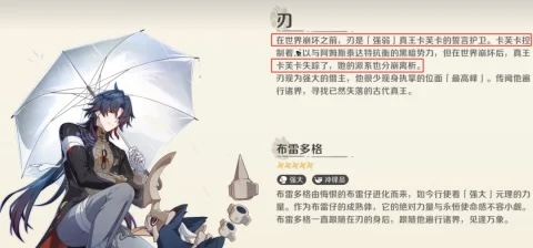 其真实身份的进一步确认,源自角色“刃”的证言。后者以“誓言护卫”身份长期追随卡芙卡,构成二者间稳固的契约关系。在世界尚未崩坏前,卡芙卡已展现出足以与阿姆斯特正面抗衡的战力层级;而随着崩坏事件爆发,其踪迹彻底消失于主线时间线中,仅余下若干伏笔等待后续章节补全。