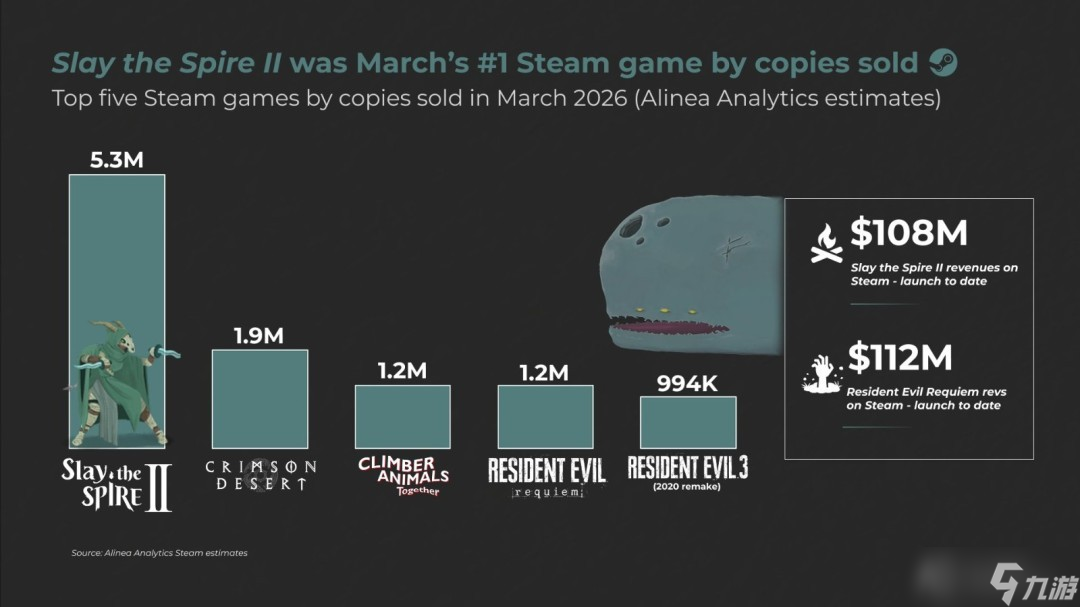 杀戮尖塔2于2025年3月5日开启抢先体验,首月即实现强劲市场表现。据专业分析机构Alinea Analytics统计,该游戏当月全球销量约达530万份,仅Steam平台便贡献收入1.08亿美元,稳居当月销量榜首。Pearl Abyss开发的红色沙漠以近200万份销量位列第二。