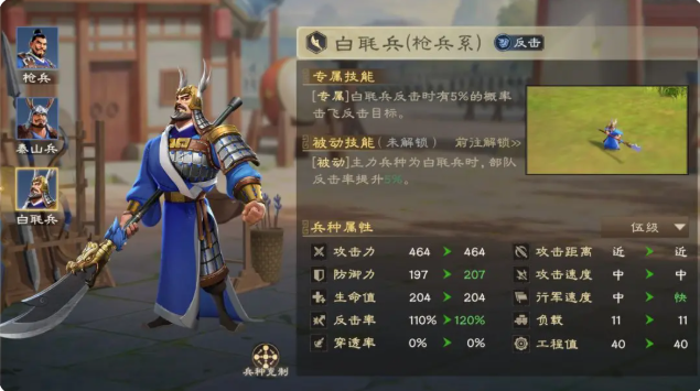 其实这个阵容的潜力还是很大的,就是看大家会不会用其他的兵种以及阵法搭配,这个阵容现在推荐的兵种就是白毦兵,这个兵种作为主力兵种的话,特有的反击率加成能提升队伍的整体反击次数,而在阵法方面,冲轭阵是搭配效果比较好的,主要是用来增强反击伤害的,此外就是这两个武将在技能等级方面的提升,特别是关羽的核心被动,依赖反击机制的他们对于这个技能的效果影响更大。