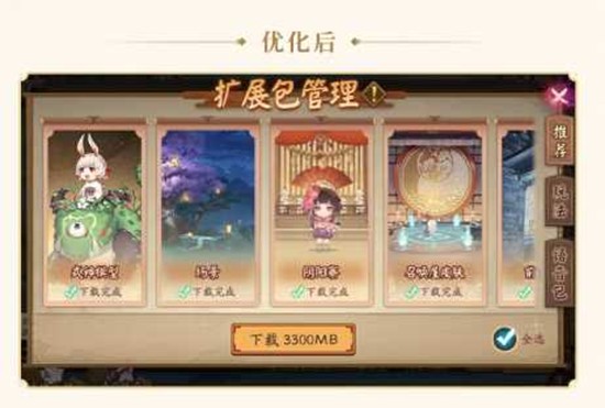 设置-拓展包管理界面迎来迭代优化,大人可以更直观地看到各个拓展包所对应的资源类型(式神模型、场景、阴阳寮、召唤屋皮肤等),选择需要的拓展包下载,资源管理更加清晰明了。