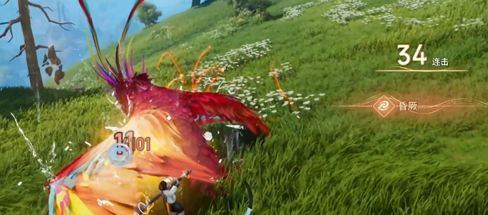 闪避反击打出去之后,如果用的是源流这个武器,会看到手边出现一圈圆形的光,顺时针转着往手里汇聚。这时候再点一下鼠标左键,就能放出源流的特殊技能,叫一瞬激流。这招打出去之后,火隼还是会继续出招,同样是看翅膀,翅膀到最高点的时候闪开就行,和前面一样。