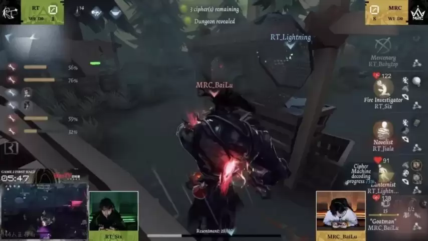 - 第二局“跛脚羊”:压迫感十足,上场仅20秒便熟练运用围笼击伤求生者。后续围绕密码机展开的运营稳健如山,再度斩获四抓。
