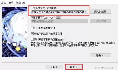 这样IDM就会自动过滤,只寻找图片。完成后,继续“前进”。