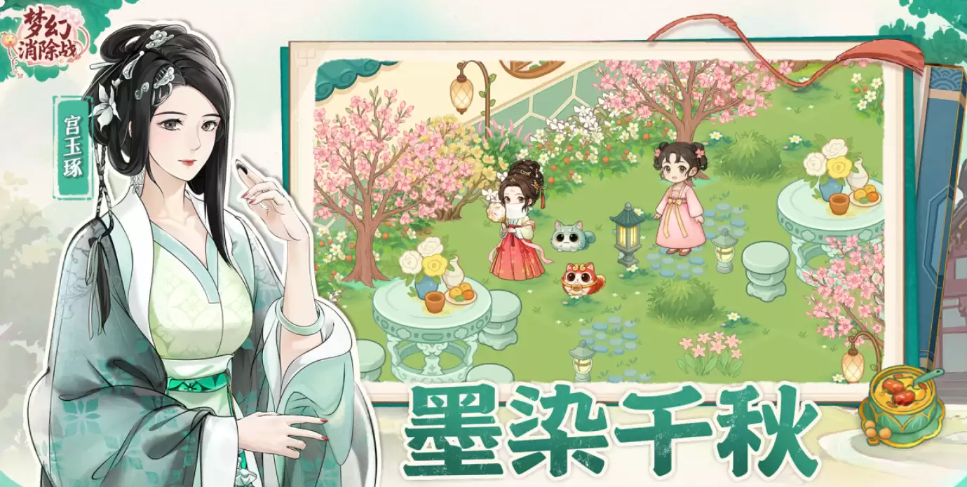 融合古风美学与消除闯关逻辑的差异化作品,背景设定于水墨意境的东方幻想世界。核心玩法在经典三消基础上叠加“合成升级”与“灵宠养成”双支线系统,角色服饰、UI图标及技能特效均采用传统纹样与釉彩风格,强化文化沉浸感与视觉记忆点。