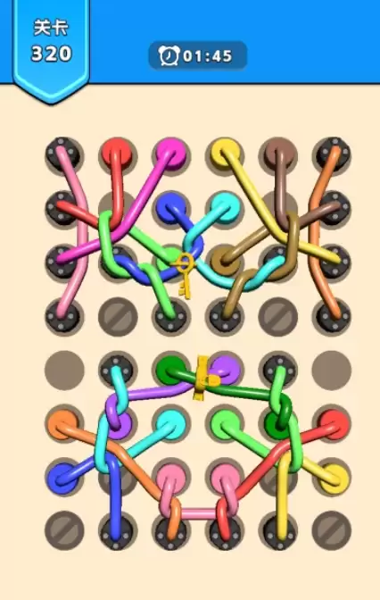 主打物理绳索缠绕解构机制的垂直向消除小品,通过点击、滑动调整绳结位置实现颜色归类与路径清除。全3D建模配合环绕音效,增强空间代入感;关卡内置差异化倒计时规则,提升重复可玩性。色彩渐变丝带与流体动画共同营造出高辨识度的解压视觉语言。