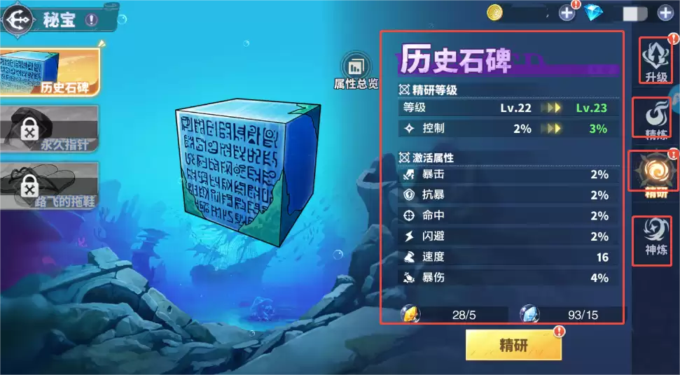 历史石碑(秘宝)前往秘宝界面精研石碑,属性加成非常高