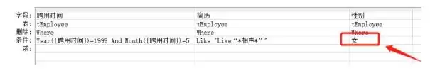 假设我们只针对女性员工。在“性别”字段的“条件”行里,简单地输入: